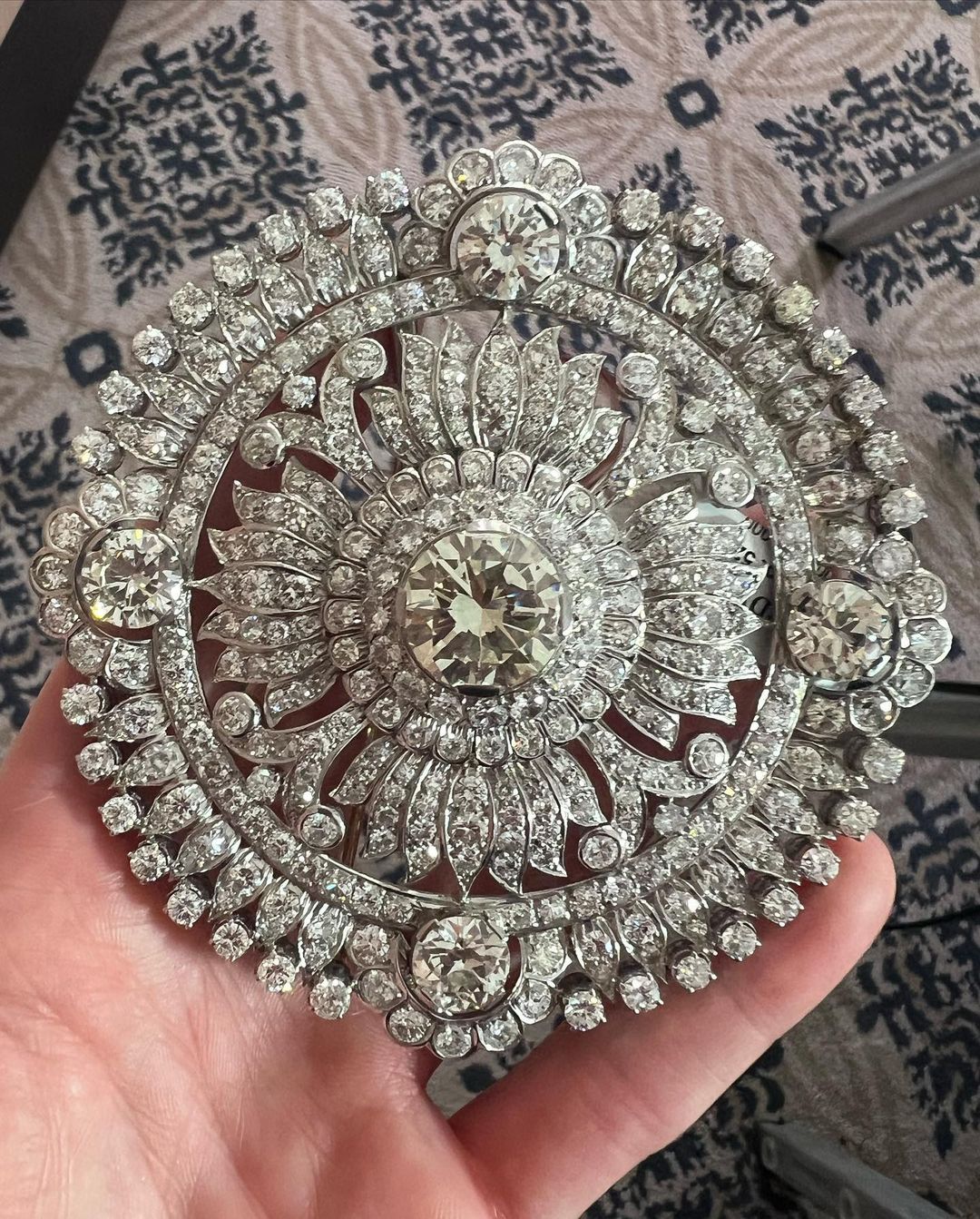 Another Art Deco Van Cleef & Arpels diamond circular brooch, designed with the sartorially savvy in mind. What sets this creation apart is its versatility—it’s not just a brooch; it’s a statement piece that can be attached to a scarf, transforming a mundane accessory into a dazzling display of craftsmanship.