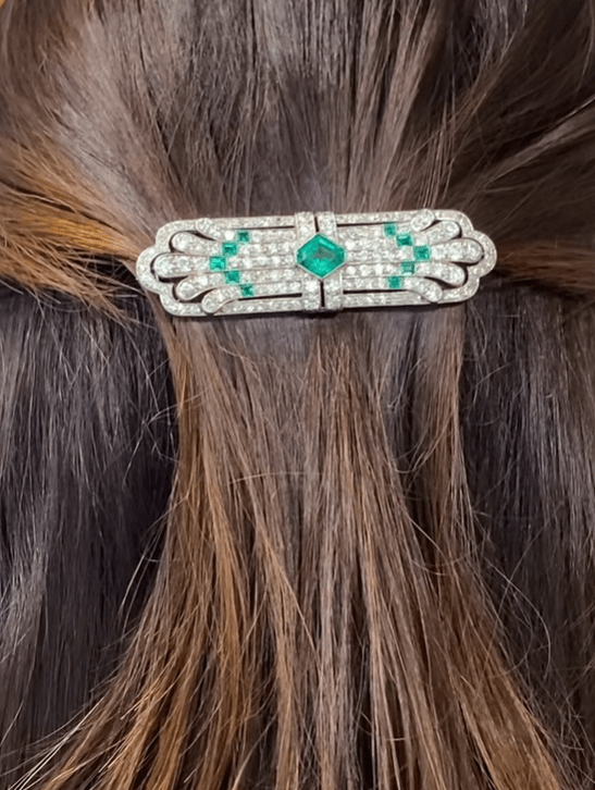 Imagine an Art Deco emerald and diamond brooch that not only adds a touch of glamour to any outfit but takes it a step further by adorning your hair. Yes, you heard it right—the latest trend is to wear these intricate pieces in your hair, turning heads and setting trends with every stride. It’s a bold move that pays homage to the bold era from which these designs draw their inspiration.
