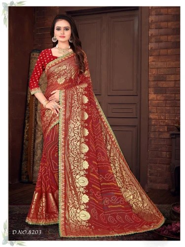 These saris are adorned with tiny dots and patterns created by tying small portions of the fabric with thread before dyeing. The intricate designs of Bandhani saris vary from simple dots to elaborate motifs like flowers, leaves, and geometric patterns. Each Bandhani sari is a testament to the skill and patience of the artisans who meticulously create these mesmerizing patterns.