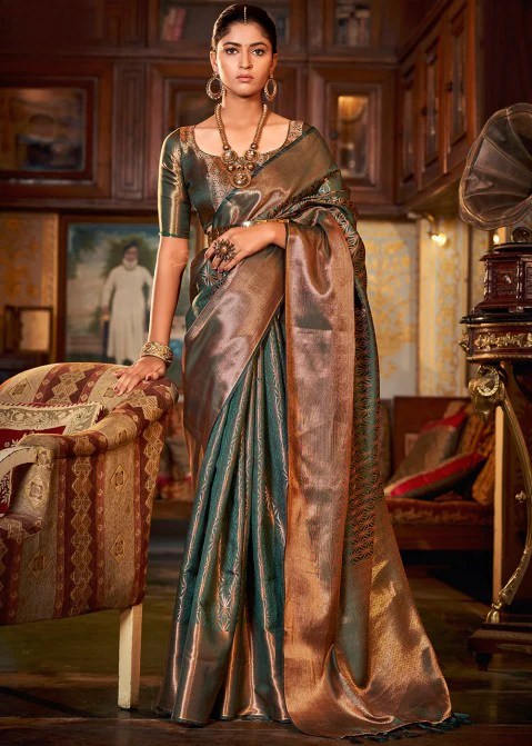 Originating from the town of Kanchipuram in Tamil Nadu, Kanjeevaram saris are renowned for their rich silk fabric and intricate zari work.