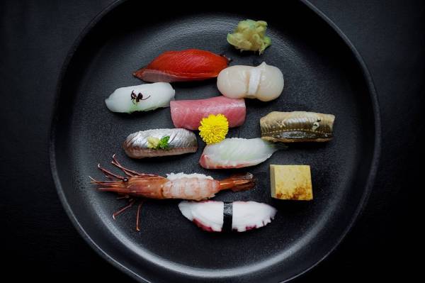 Once all the pieces of sushi are assembled on the plate, a sprinkling of gold leaf is added as the final touch.