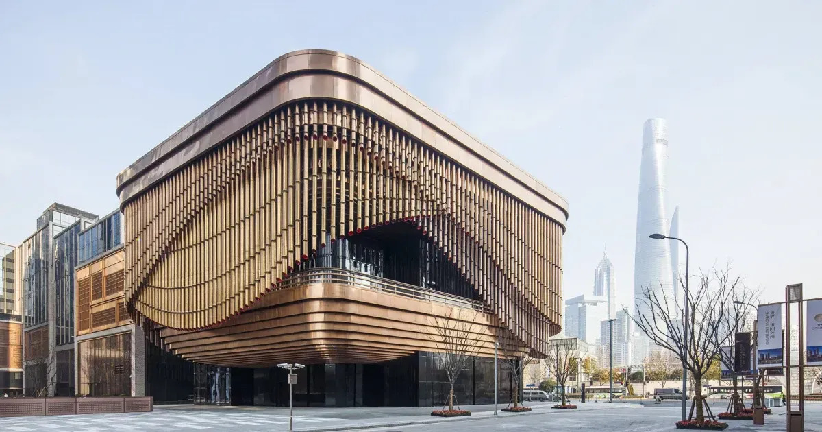 The cultural centre’s defining feature is its dynamic, kinetic facade—made of three layers of bronze tubes that resemble traditional Chinese theatre curtains. These tubes move and rotate, creating an ever-changing visual experience that responds to the building’s events and the environment.