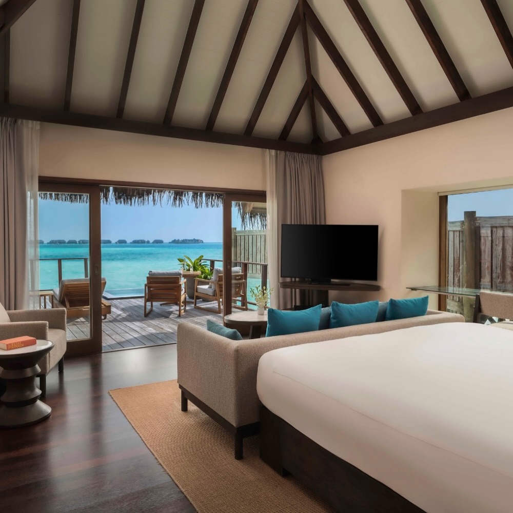 The resort’s other accommodations are equally spectacular. From overwater villas with glass floors offering glimpses of the sea life below to beachfront retreats nestled in lush foliage, each space is designed to offer unrivaled comfort and breathtaking views. The rooms blend contemporary elegance with Maldivian charm, ensuring an intimate connection with nature.