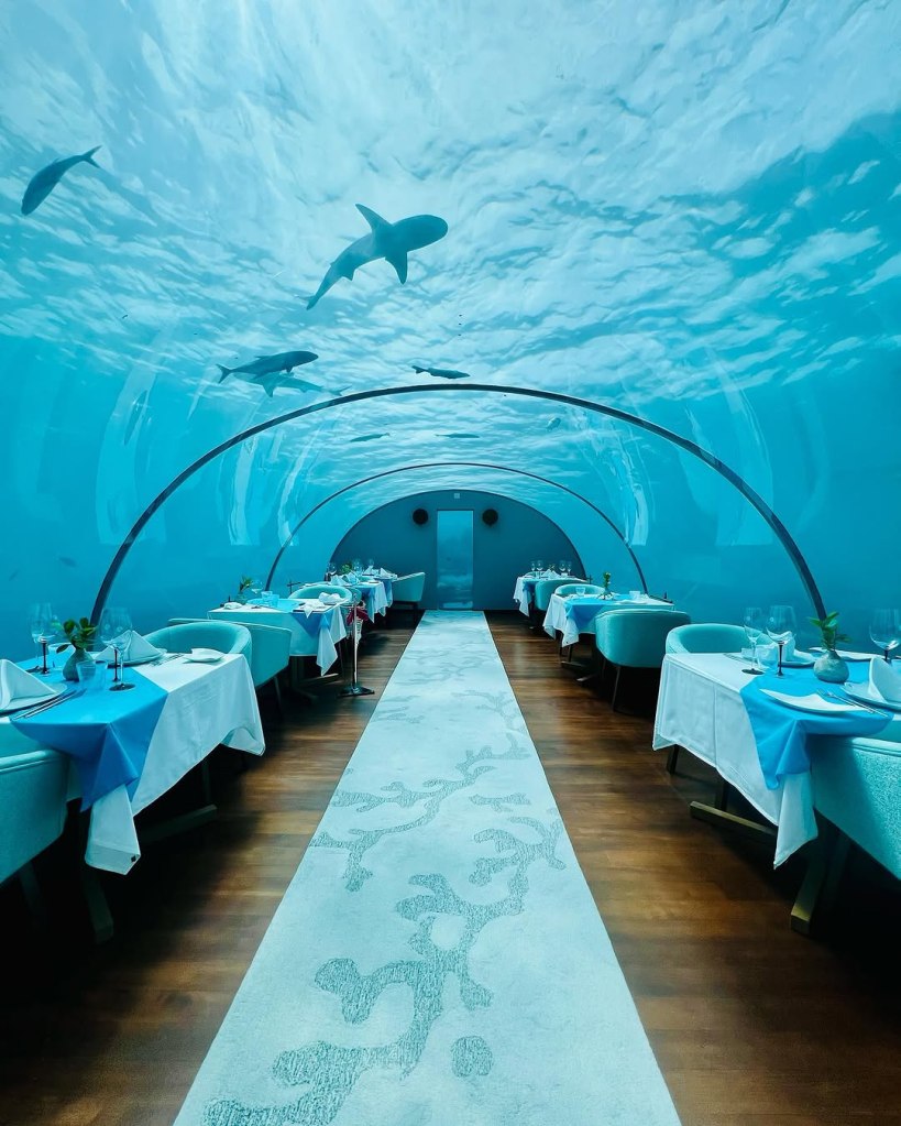 Aqua-Living Extravaganza: The highlight? The Muraka, the world’s first underwater residence. This two-level villa is a masterpiece of design and imagination, featuring a master bedroom submerged 16 feet below sea level. Floor-to-ceiling windows surround the underwater suite, creating an immersive experience where guests can watch manta rays glide by and vibrant schools of fish dance in the current. It’s a mesmerizing connection to the marine world, enhanced by luxurious interiors, from bespoke furnishings to state-of-the-art amenities. Above sea level, the villa offers an infinity pool, expansive sun deck, and private butler service, ensuring every whim is met with effortless grace.