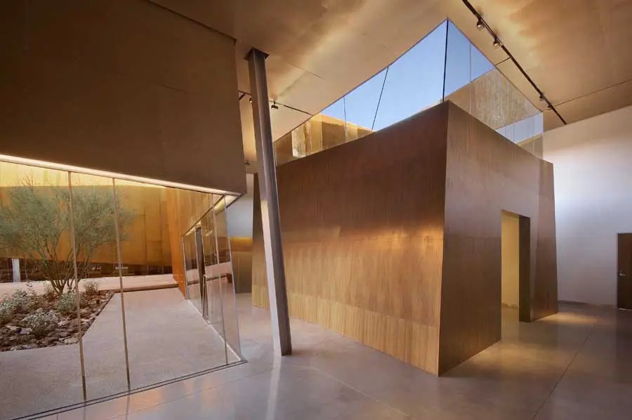 Nestled in the desert landscape of Scottsdale, Arizona, the Arabian Library stands as a modern homage to the natural beauty of the American Southwest. Designed by Richard Kennedy Architects, the library draws inspiration from the region’s iconic slot canyons. Its exterior features weathered steel plates that mimic the reddish hues and textures of canyon walls, creating a seamless blend with the surrounding environment. Visitors enter through a “slot canyon” of steel and glass, where angled walls lean overhead before opening up to the expansive sky, evoking the experience of traversing a natural canyon.
