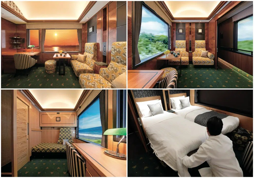 With a maximum capacity of just 34 guests across 10 carriages, exclusivity is as intrinsic as the brass fittings that gleam against rich lacquered surfaces. Think art deco opulence meets Kyoto sophistication, with soft gold hues, deep greens, and expansive windows framing the ever-changing canvas of Japan.