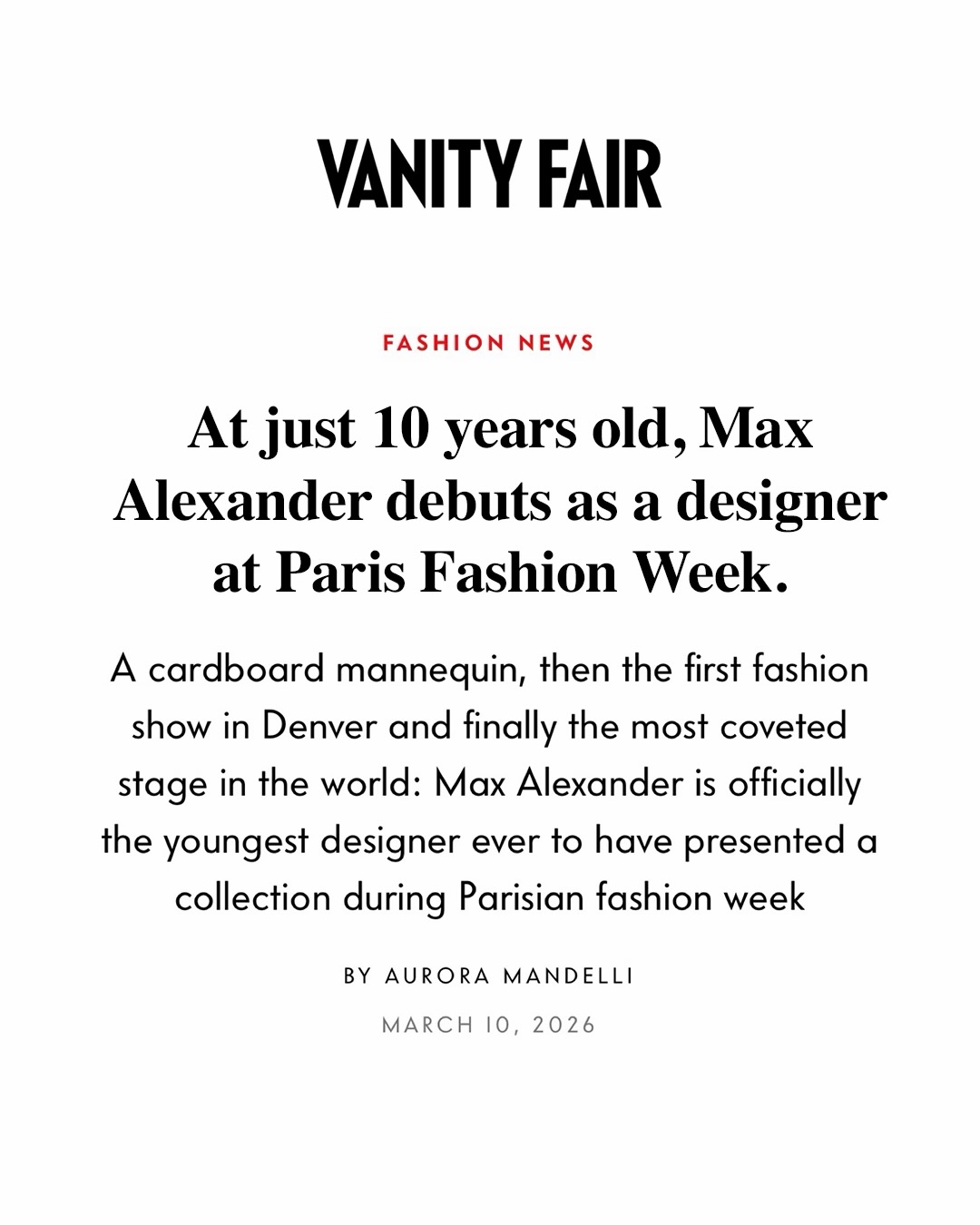 By the age of ten, Max had already achieved something most designers spend their entire lives chasing: a debut at Paris Fashion Week and recognition from Guinness World Records as the youngest person to design and stage a runway show.